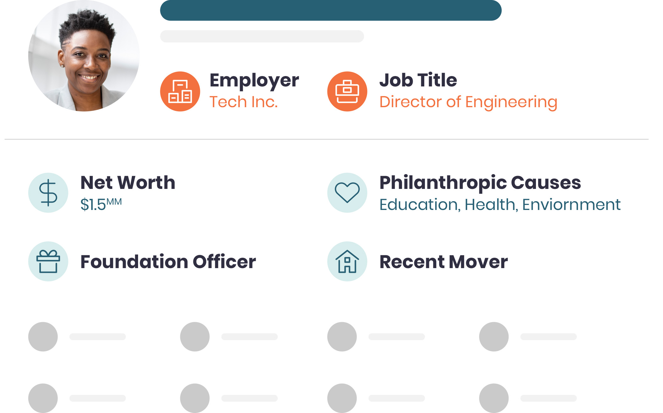 Segment your high-net worth constituents by the philanthropic causes they support, their political party affiliation, recent life events, whether they have a Family Foundation, and much more!