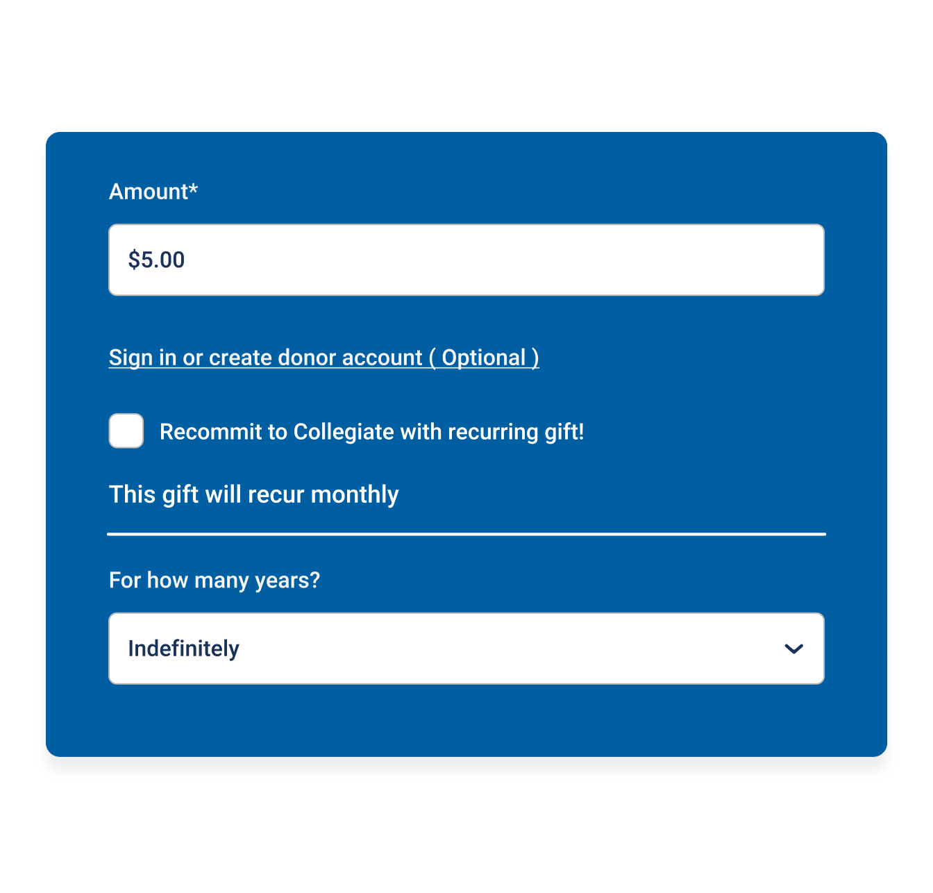 Accept donations that continue to have an impact for months and years to come—or indefinitely. The expected value of an indefinite recurring gift on the GiveCampus fundraising platform is 10x larger than a one-time gift.